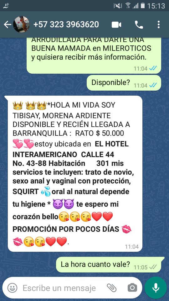 Con razón le escribí preguntando por la hora y jamás me respondió, eso fue ayer. Yo que de por sí cuando son así de bacanas y buen servicio pido son 2 hrs para poder disfrutar como se debe, lástima ese detalle de sólo trabajar por ratos, muy buena y todo pero a mi en lo personal no me conviene, quedo picado y se que en media hora no me vengo asi de fácil... lástima eso de Tibisay.